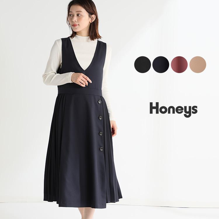ジャンパースカート ジャンスカ Vネック 大人 ロング ミモレ 無地 プリーツ 秋 秋新作 Honeys ハニーズ プリーツ切替ジャンスカ ハニーズ オンラインショップ 通販 Paypayモール